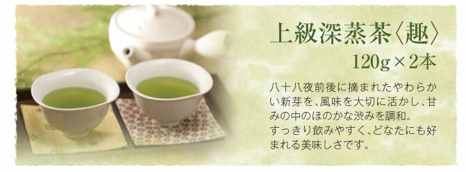 | セット内容 | ・上級深蒸し茶<おもむき>120g×2袋 ・鎌倉彫調茶筒×2(柄違い) ・化粧箱 |