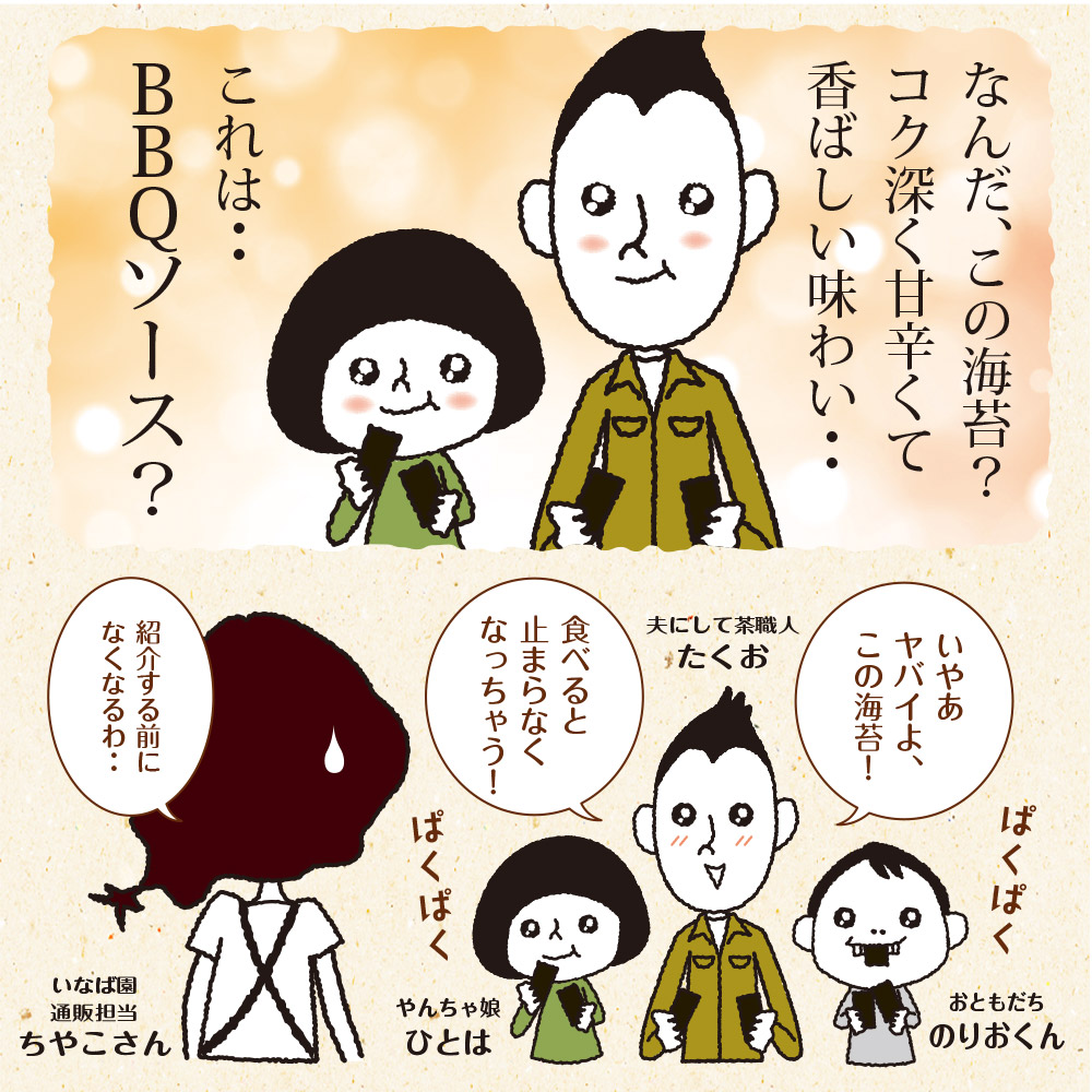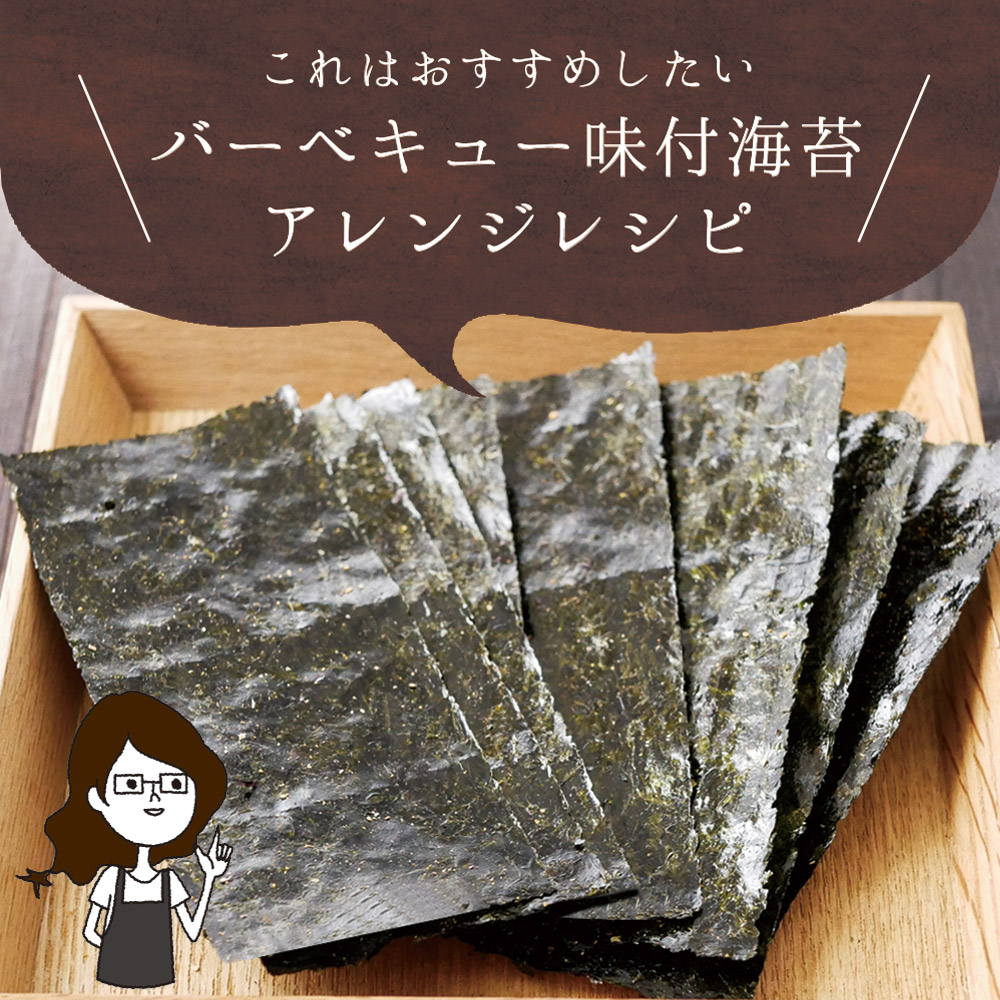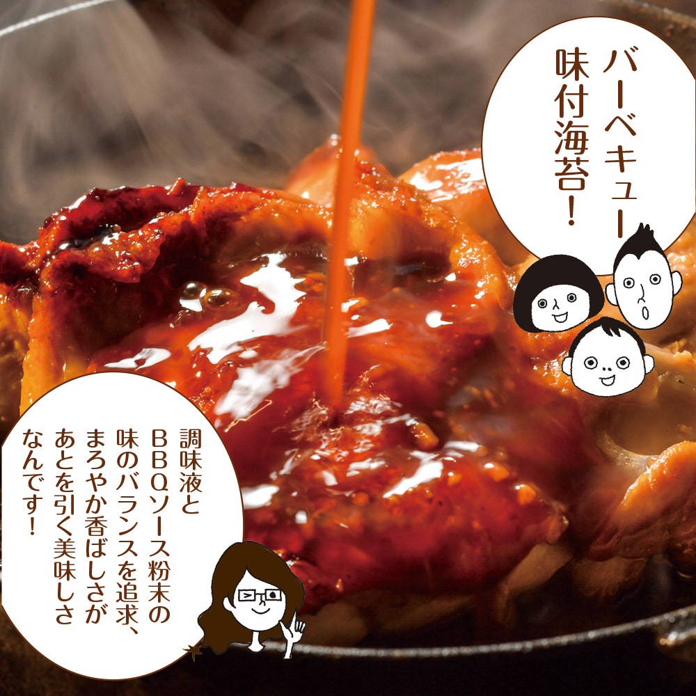 乾のり(有明海産)、調味液(砂糖、醤油、魚介エキス、その他)、バーベキューシーズニング(食塩、砂糖、蛋白加水分解物、トマト風味パウダー、粉末ソース、ガーリックパウダー、その他)/調味料(アミノ酸等)、香料、微粒二酸化ケイ素、甘味料(ステビア、カンゾウ、スクラロース)、着色料(カラメル、パプリカ色素)、酸味料、香辛料抽出物、くん液、(一部にえび・小麦・大豆・豚肉・りんごを含む)